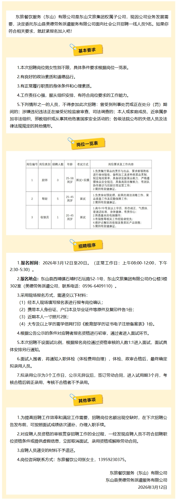 2026年漳州东山东饮餐饮服务有限公司招聘9人公告