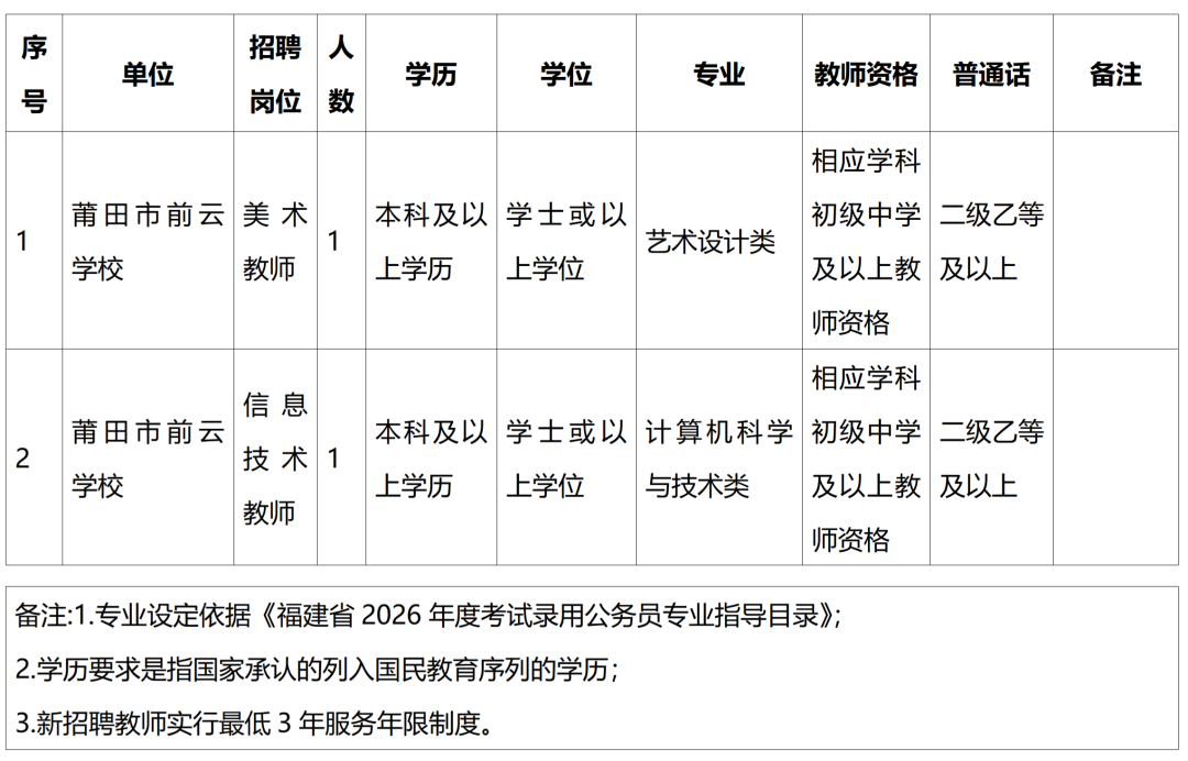 为确保莆田市前云学校正常教学对师资的需要,根据省教育厅、省委编办、省财政厅、省人社厅《关于进一步做好全省中小学幼儿园教师补充工作的若干措施》(闽教规〔2022〕3号)和省教育厅、省人社厅《关于2026年全省中小学幼儿园教师公开招聘笔试服务工作的通知》(闽教师〔2026〕2号)文件精神,结合莆田市前云学校实际情况,莆田市公安局将组织实施2026年莆田市前云学校公开招聘新任教师工作,现将有关事项公告如下: