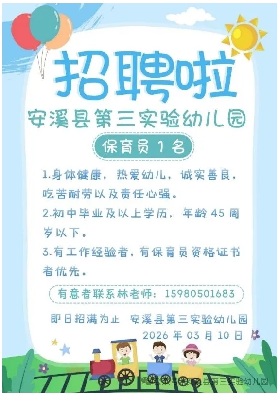 原标题:【招聘公告】安溪县第三实验幼儿园招聘1名保育员