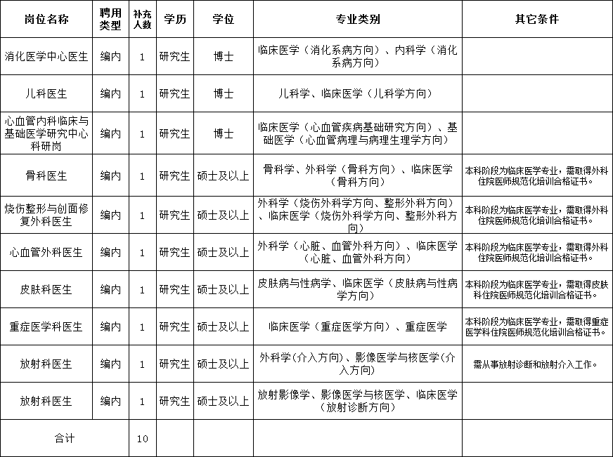 因工作需要,拟向社会公开招聘医疗卫生紧缺急需人才10名,根据事业单位公开招聘有关规定,制定招聘方案如下: