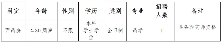 为满足医院工作需要,现面向社会招聘西药房编外合同制工作人员1名。